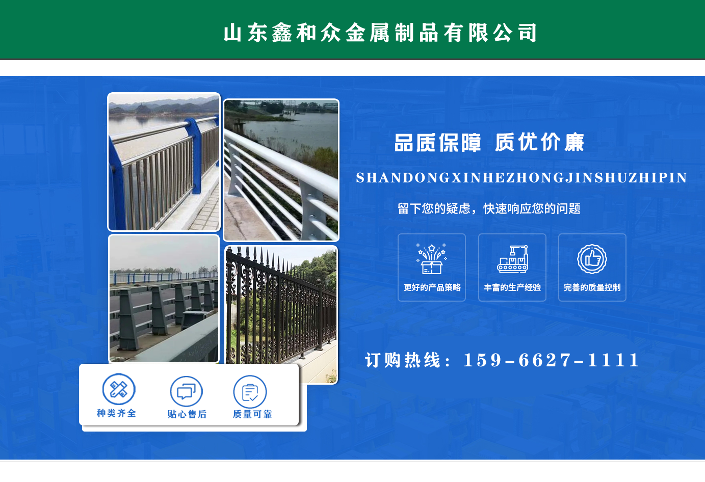 山東鑫和眾金屬制品有限公司主要產品有防撞護欄,橋梁護欄,道路護欄,河道護欄,不銹鋼護欄等護欄。提供設計方案,一站式定制,包您滿意價格優惠,歡迎來電咨詢! 公司常年從事銷售護欄防撞護欄,橋梁護欄,道路護欄,河道護欄,不銹鋼護欄,橋梁鋼護欄,河道燈光護欄等。產品廣泛應用于橋梁、河道、旅游景區、道路、公路、公園、小區、景觀、道路防撞等領域?! 」井a品均采用優質不銹鋼材料,符合相關標準。各種型號不銹鋼復合管及護欄,質量嚴格把控。產品強度高、耐腐蝕、焊接牢固、抗沖擊、性能好,防撞護欄結構簡單、美觀實用大方。 歡迎前來訂購!...